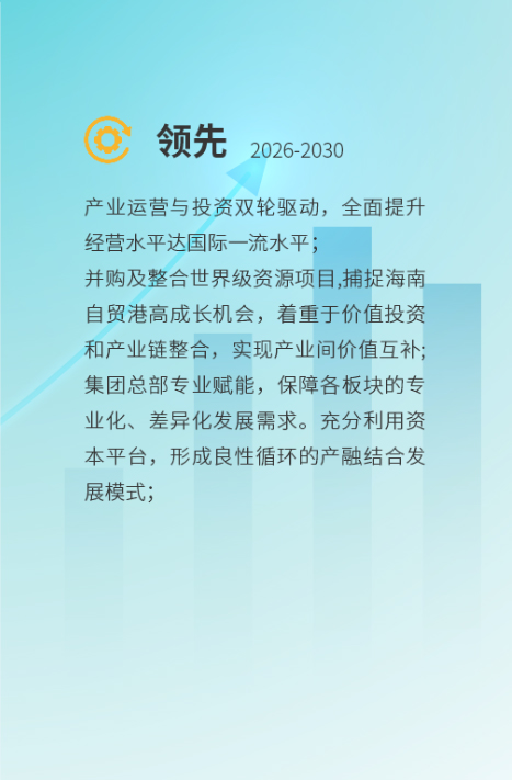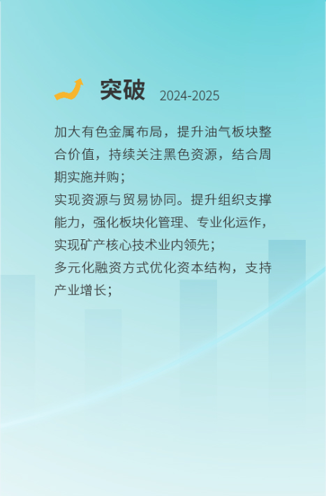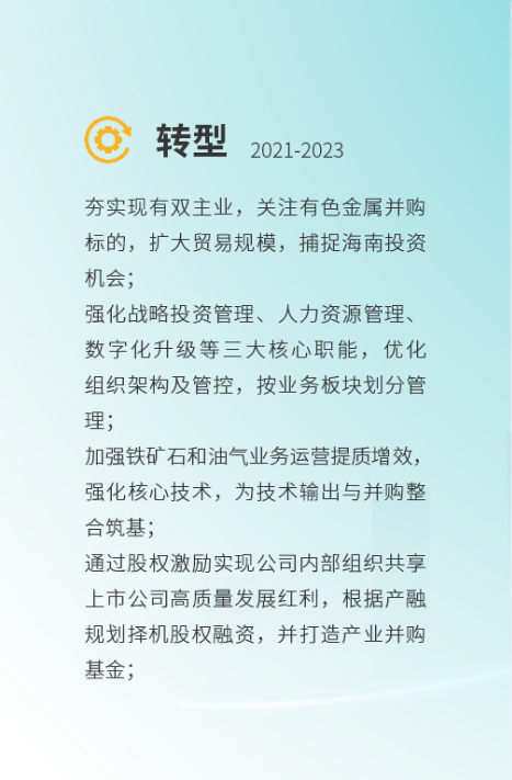 我们坚持"产业运营+产业投资"双轮驱动,持续推进战略转型,目前已完成"铁矿石+油气+新能源"三大赛道的产业布局。